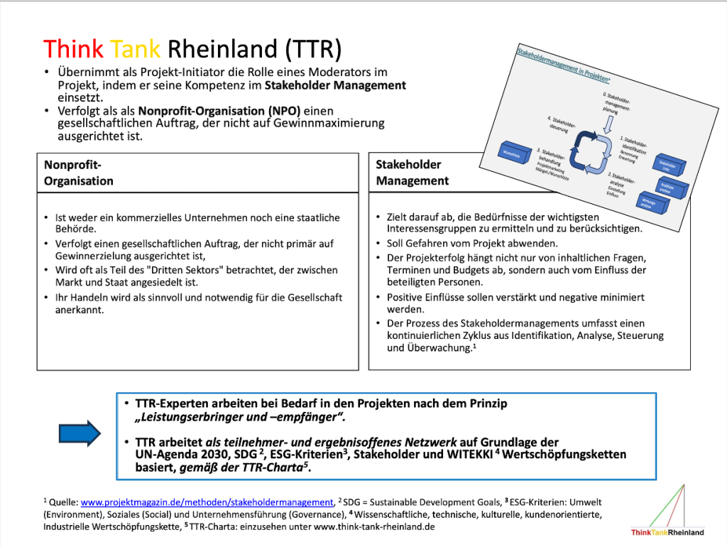 Der TTR agiert als Moderator im Projekt und nutzt gezieltes Stakeholder-Management, um relevante Interessengruppen effektiv einzubinden und deren Bedürfnisse strategisch zu steuern. Durch transparente Kommunikation und enge Zusammenarbeit werden Synergien geschaffen, Konflikte reduziert und langfristige Partnerschaften gefördert.