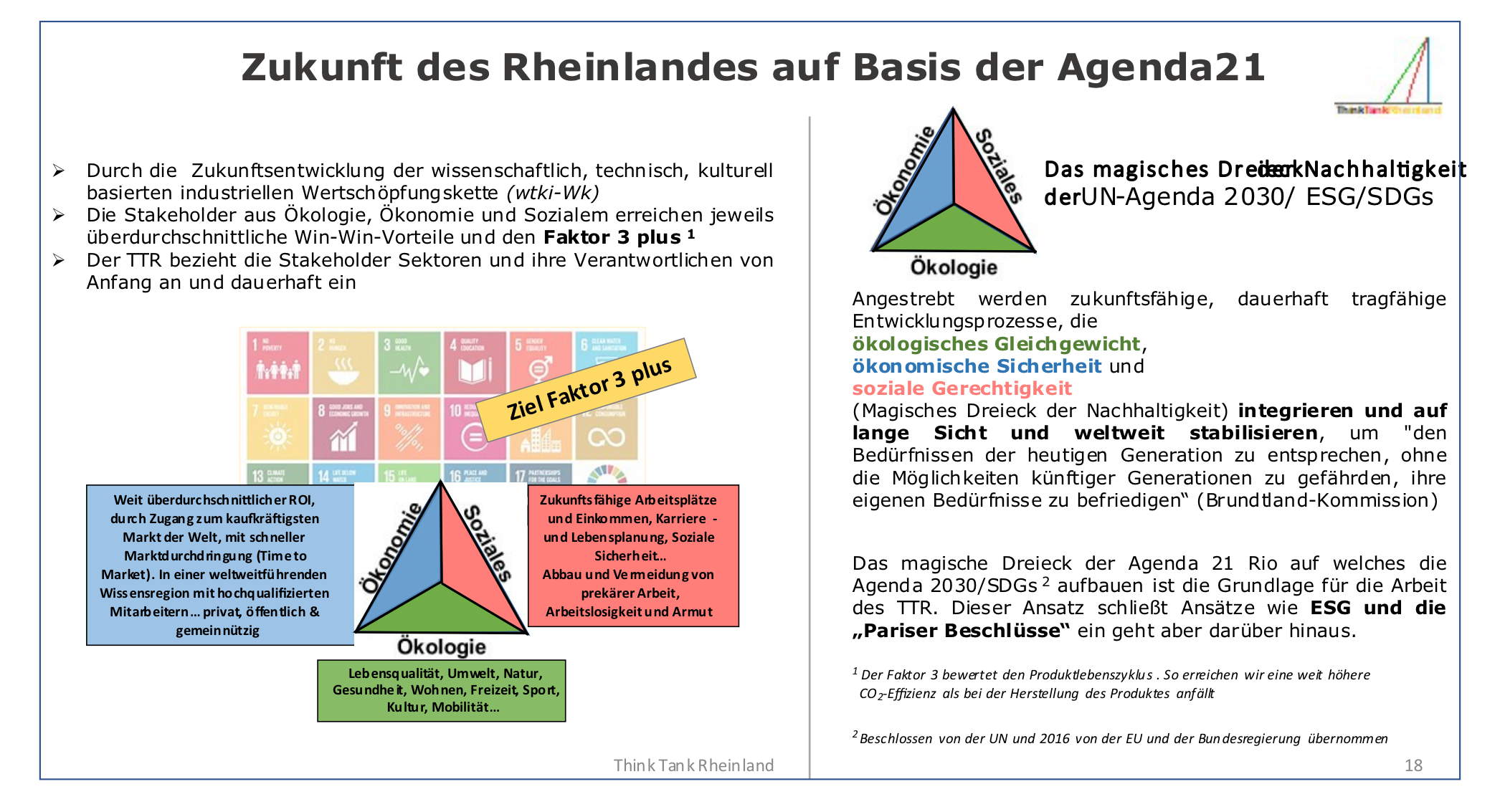 Der TTR arbeitet auf Basis seiner Charta auf Grundlage der UN-Agenda 2030, SDG und ESG. Das heißt Ökologie, Ökonomie und das Soziale (Menschen, Mitarbeiter, Manager: „Humankapital“) bedingen inhärent einander. Ohne die Innovationspotentiale der Mitarbeiter ist die Transformation, welche die EU als und Deutschland auf Basis des EU New Green Deals, der Taxonomie und der ESG und Ziele Paris global beschlossen haben, nicht zu erreichen.